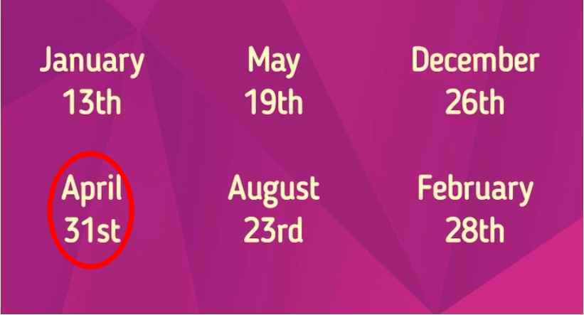 The mistake in the picture is that the month of April has 30 days, whereas it shows April 31st.