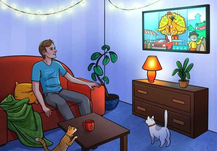 In the image shared above, a living room scene can be seen where a guy can be seen watching TV along with his two cats.