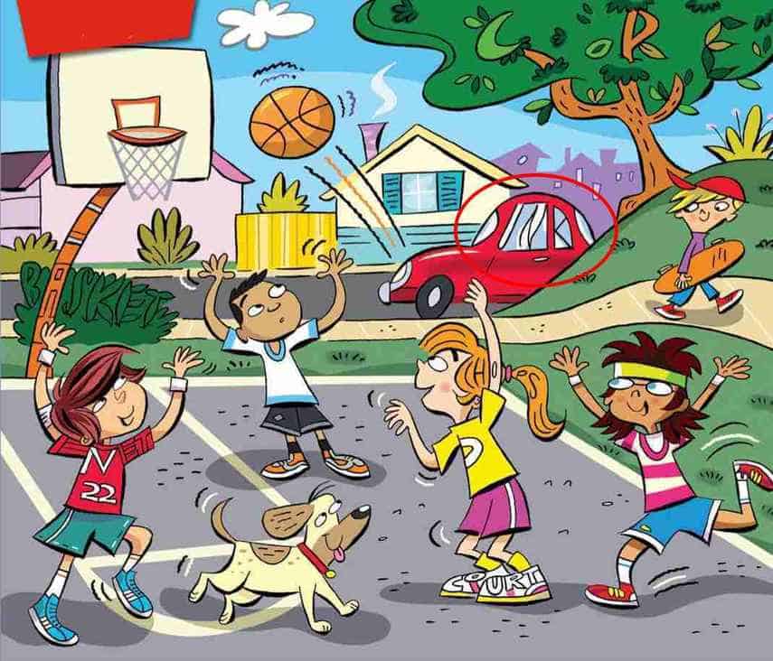 The hidden word “dunk” can be spotted on the window of the red car that is parked near the court.