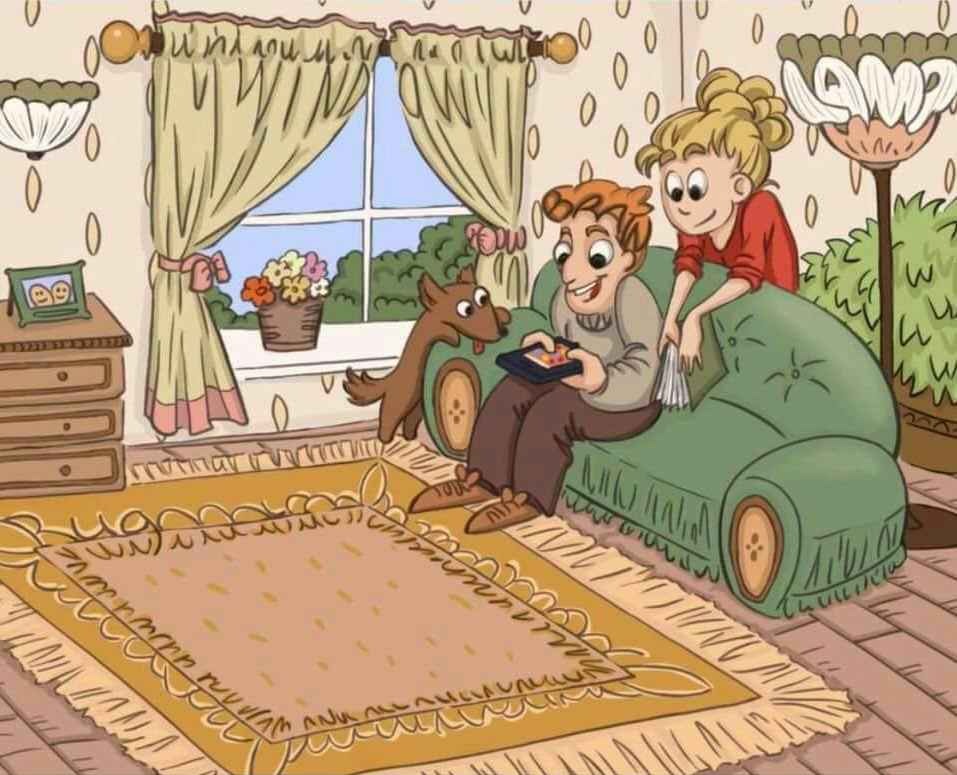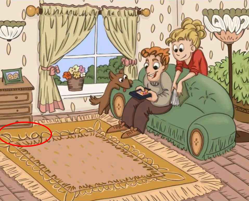 The hidden word “rug” can be spotted on the corners of the rug placed in the living room.