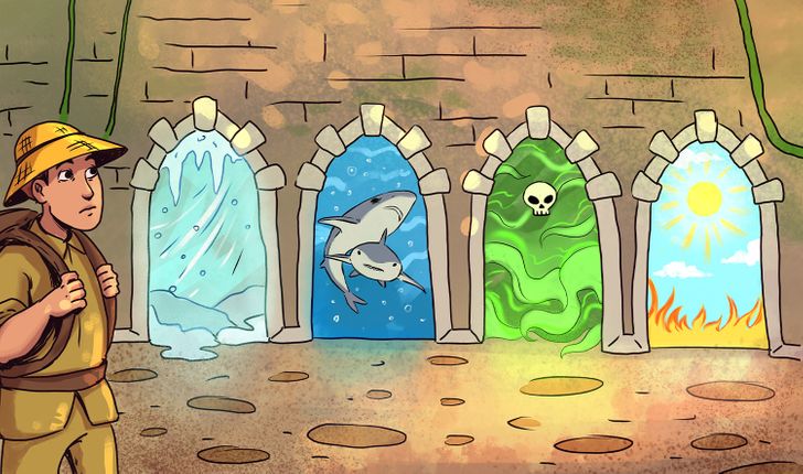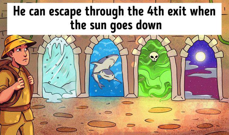 In the above image, you need to identify the door through which the man can escape safely from the place where he is stuck. The puzzle states that “a man got kidnapped and locked in a house. The house had 4 doors and he could escape through one of them… How can he escape?” You need to find the door that is the safest exit for the man.