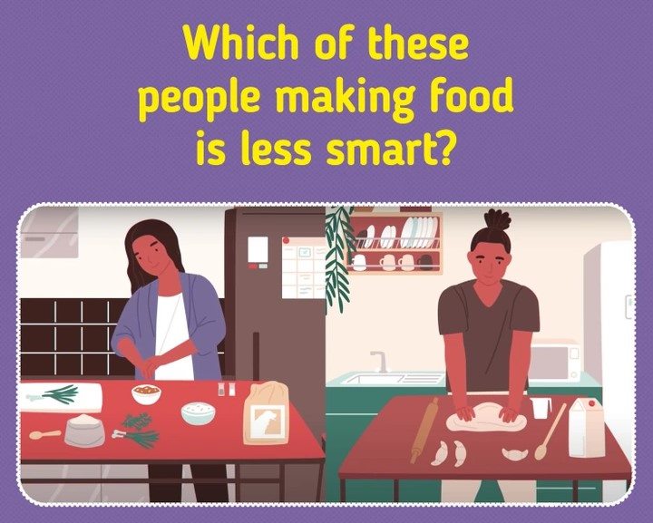 This puzzle was created as a brain teaser to test your intelligence level. In the image, you can see two people cooking inside their kitchen. The woman on the left side is sprinkling something over the bowl and the person on the right side of the picture is making dough. The puzzle challenges the viewers to find the dumb person among the two by asking “Which of these people making food is less smart?”.