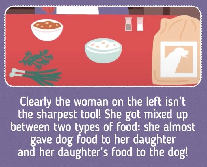 This puzzle asks you to find out which person among the two is not that smart. Both the person are making food in a very neat and tidy manner. However, one person is making a big mistake while cooking the food. It’s the woman on the left side of the picture. She got mixed up between two types of food. She almost gave dog food to her daughter and her daughter’s food to the dog.