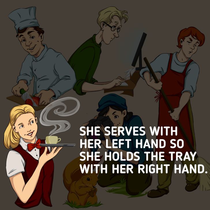 So, the answer to this mental puzzle is that the waitress is a left-handed person. For lefties, it’s easier to hold a tray in their right hand and serve dishes and drinks with their left one. Thus, their left-hand works, and the right one is static.