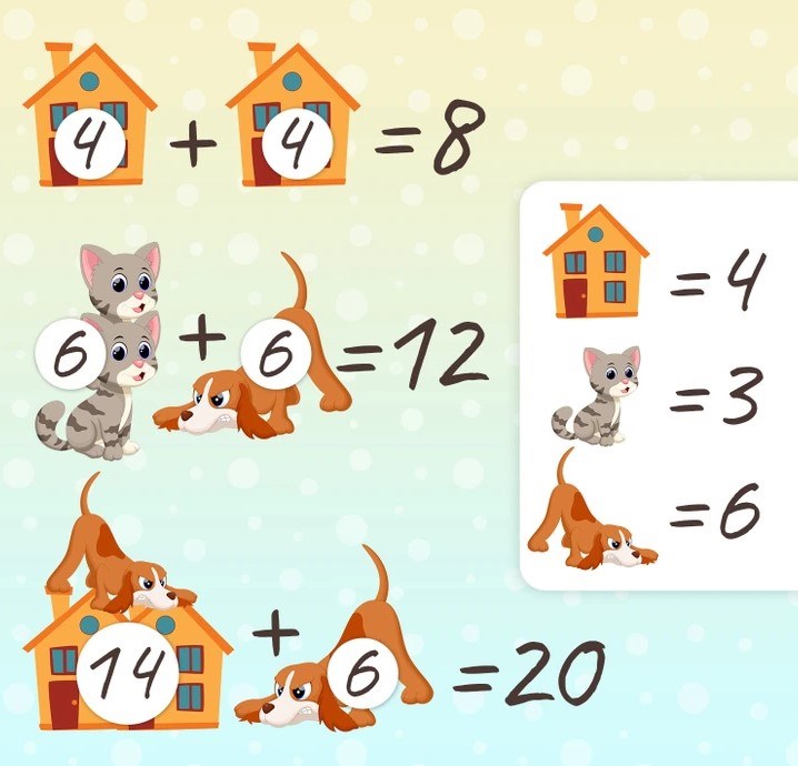 Puzzle for IQ Test: Can You Find the Value of the Cat, the Dog, and the House in the Picture?