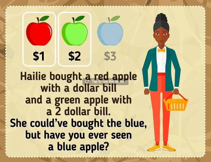 This puzzle was created as a brain teaser to test your intelligence level. In the image, you can see three apples of different colours. The puzzle challenges the viewers to guess which apples the lady buy by asking “Hailie gave $3, from which 2 were bills, to buy apples. If the red apples cost $1, the green $2, and the blue $3, which of the apples did she buy?”.