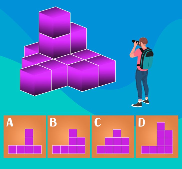 In this mind puzzle, you need to observe the shape of the purple blocks from the man’s point of view in the picture. The puzzle also gives you four options. Among these four options, only one is right. So, let’s capture the shape of blocks from the man’s point of view. There will be only one block at the top level, two blocks at the mid-level, and four blocks at the bottom level.