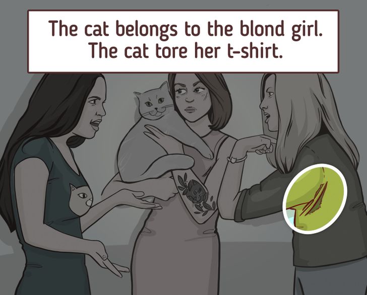 If you look carefully at the two girls who are fighting for the cat’s ownership, you will be able to identify the real cat owner. The girl in the blue shirt on the left side is claiming to be the owner of the cat. However, the cat belongs to the blond girl on the right side. The cat tore her shirt.