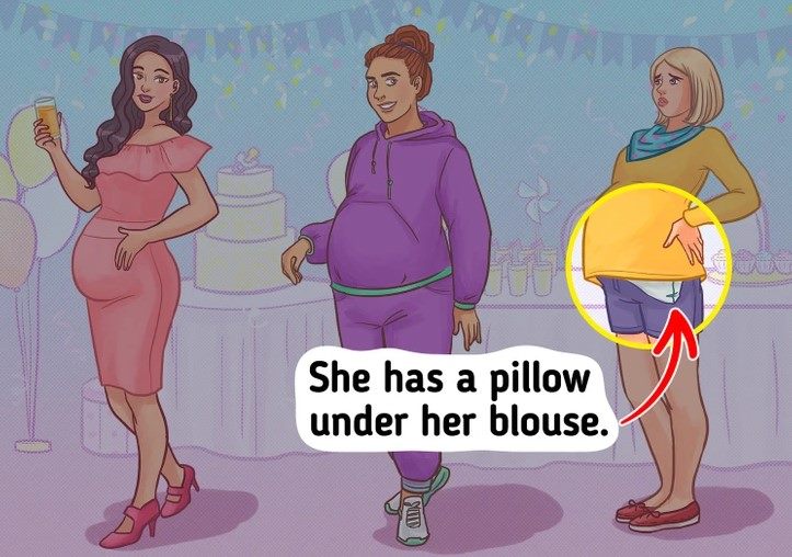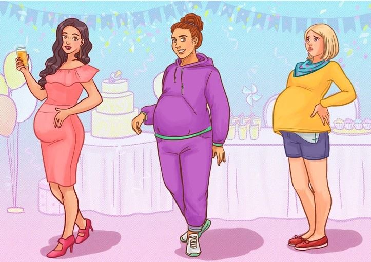 Let’s look at each pregnant woman in the picture in detail. The first pregnant woman is having drinks at the party, and the second pregnant woman is wearing a tracksuit and looks happy at the party. However, the third pregnant woman look quite worried. Also, she has a pillow under her blouse.