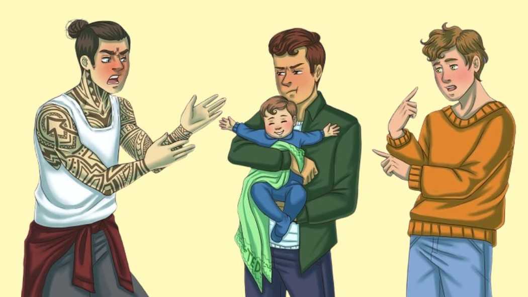 The baby’s real father is the person with tattoos on his arms, as he has tattooed the name of the baby, which is “TED”, on his biceps.