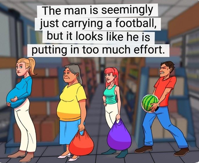This test was created as a brain teaser to test your intelligence level. In the image, you can see the four suspects who have been questioned for the theft. A watermelon was stolen inside the shop. The puzzle states that four people are waiting in line to pay for their items. However, one of them has stolen and concealed a watermelon. Who is that person? The puzzle challenges the viewers to find the thief by asking “Who stole a watermelon?”.