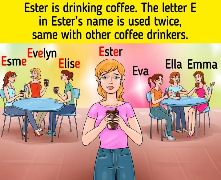 So, the answer to this brain teaser is that Ester is drinking coffee. The letter E in Ester’s name is used twice, same with other coffee drinkers.