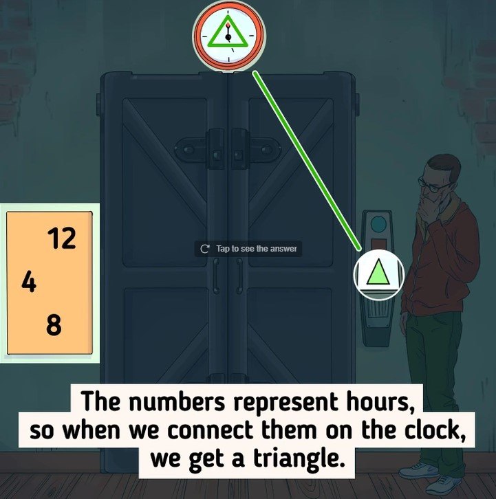 In this puzzle, you need to find the right button based on the clues given near the door. There are three buttons on the right side of the door - blue circle, red square, and green triangle. On the left side of the door, you will see three numbers written - 12, 4, 8. There is a clock above the door.