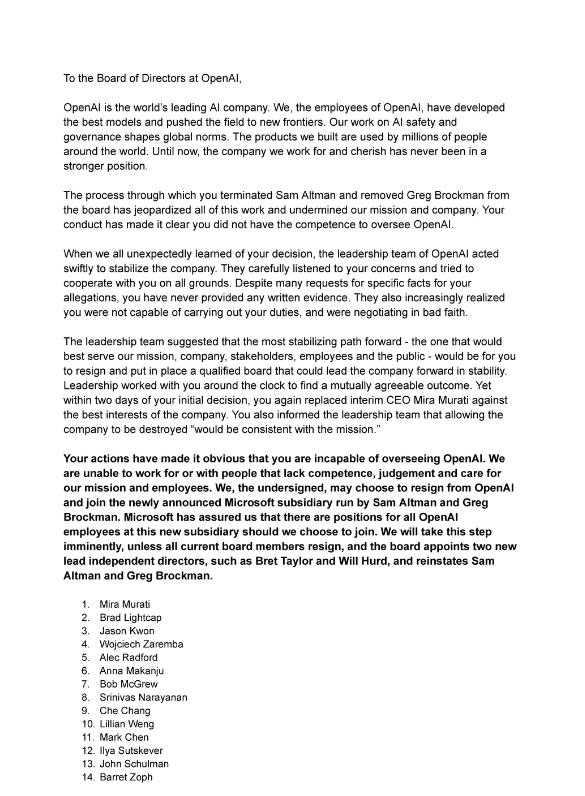 - According to the New York Times the letter criticises the board's decision to fire Altman, stating, "Your actions have made it obvious that you are incapable of overseeing OpenAl. We are unable to work for or with people that lack competence, judgement and care for our mission and employees. We, the undersigned, may choose to resign from OpenAI and join the newly announced Microsoft subsidiary run by Sam Altman and Greg Brockman Microsoft has assured us that there are positions for all OpenAl Employees at this new subsidiary should we choose to join. We will take this step imminently, unless all current board members resign, and the board appoints two new lead independent directors, such as BretTaylor and Will Hurd, and reinstates Sam Altman and Greg Brockman.”
