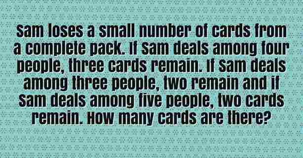 Sam loses a small number of cards from a complete pack. If Sam deals among four people, three cards remain. If Sam deals among three people, two remain and if Sam deals among five people, two cards remain.