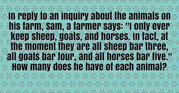 In a reply to an inquiry about the animals on his farm, Sam, a farmer says: “I only ever keep sheep, goats, and horses. In fact, at the moment they are all sheep bar three, all goats bar four, and all horses bar five.”