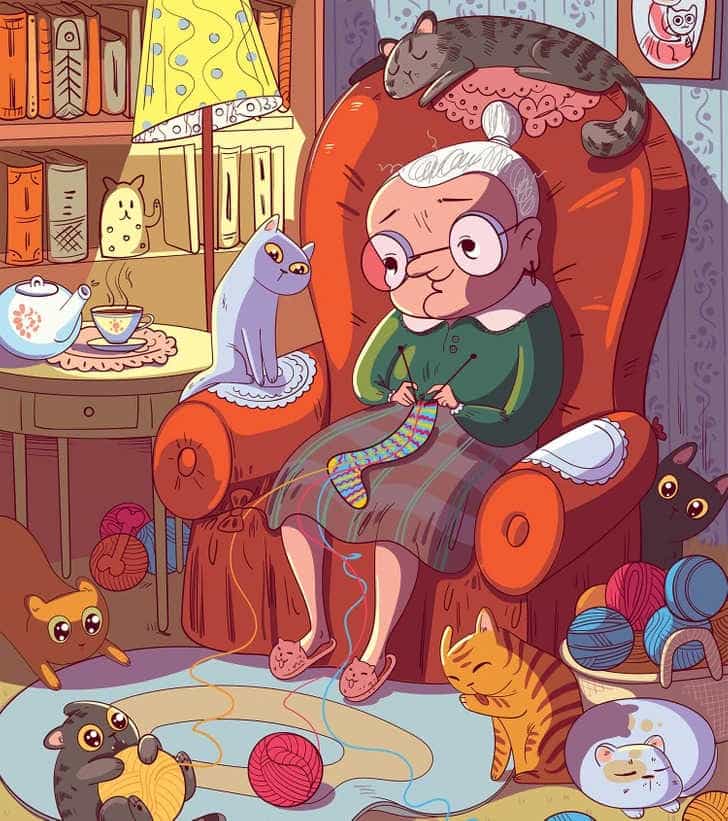 In the image shared above, the users are presented with a room picture in which an elderly lady can be seen knitting while sitting on a sofa.