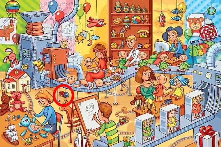 Hidden among the toys and workers is a toy truck, which you need to find in 9 seconds.