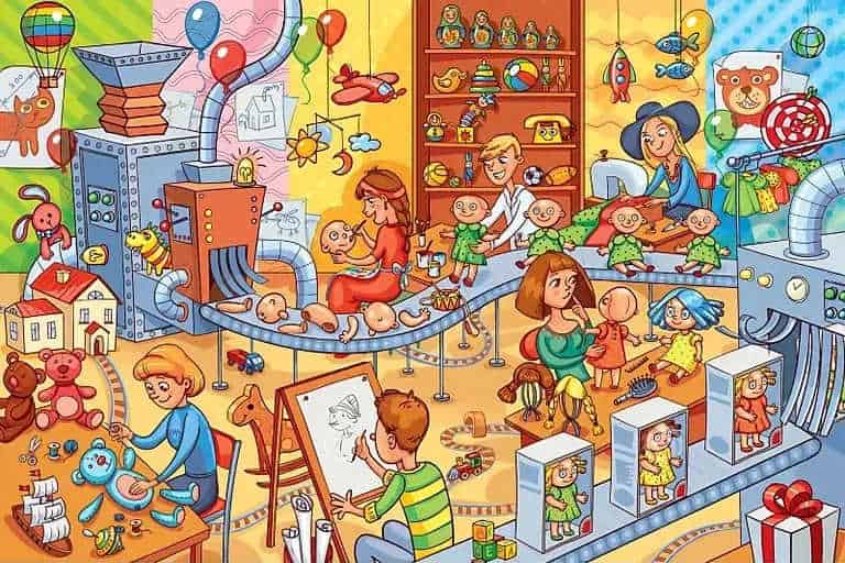 In the image shared above, you can see a toy factory scene in which toy production is going on.
