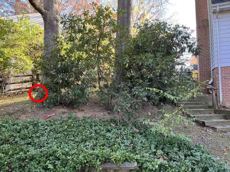 The dog can be spotted on the left side of the image; it is peeking from the left side of the big tree.