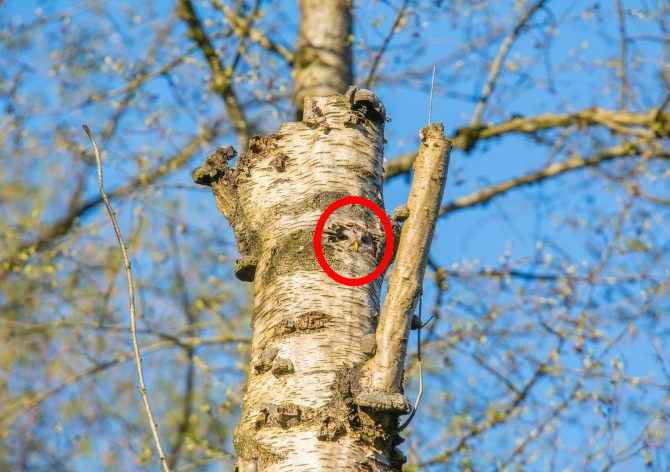 The owl can be spotted inside the hole in the tree. It is identified by its appearance, which appears different from that of the tree.