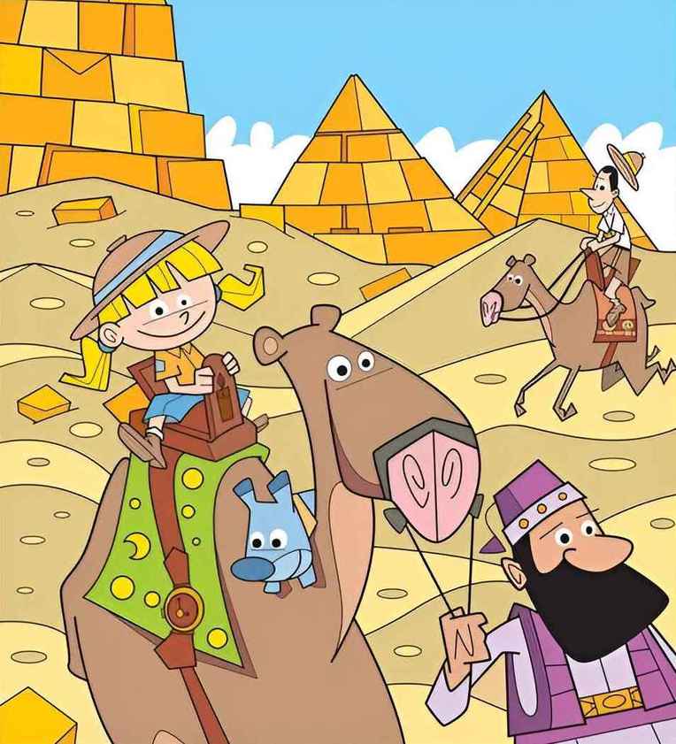 Pyramids can be seen in the background, while in the foreground, tourists can be seen riding camels.