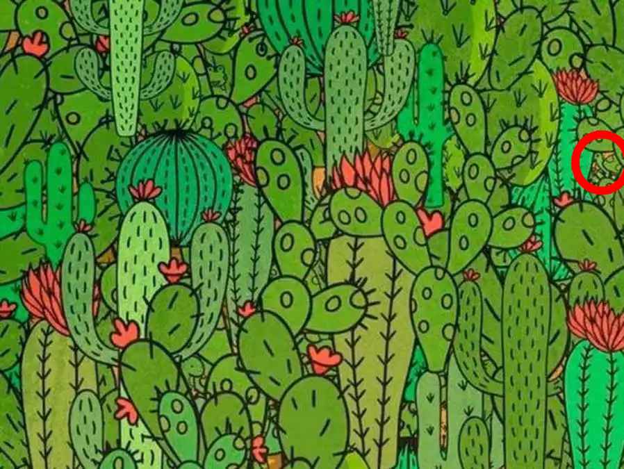 The turtle can be seen on the right side of the picture. It is small and green in colour thus effortlessly blending in with the cacti.