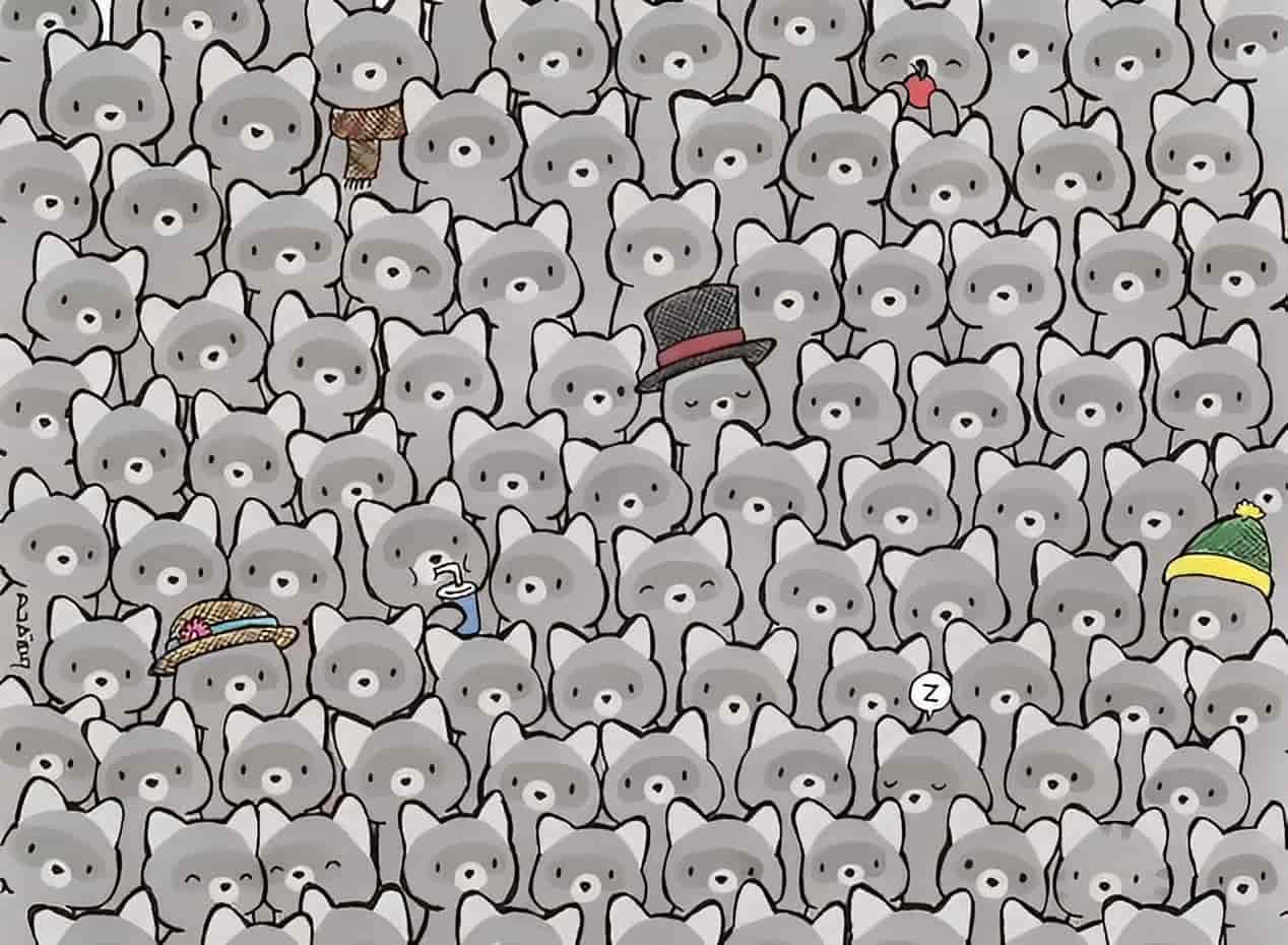 A cat has somehow sneaked among the raccoons, and you need to find the hidden cat within 5 seconds.