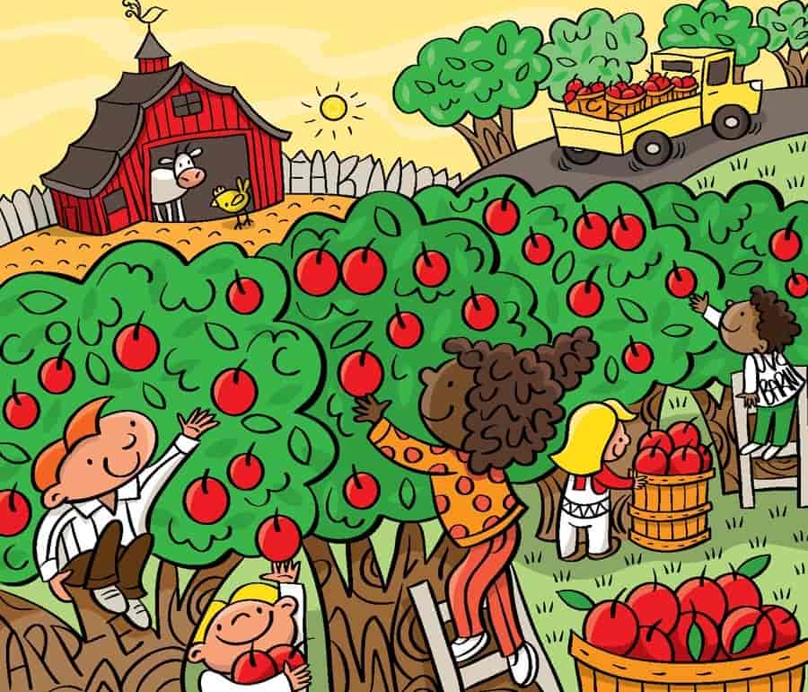 The image shared above depicts a farm where apple harvesting is going on. People are busy collecting apples on a bright sunny day.