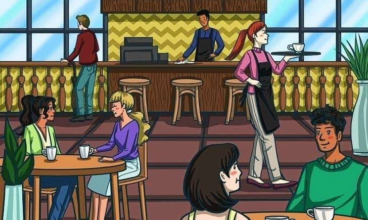 The image shared above presents a cafe scene in which people can be seen enjoying their time by indulging in gossip and sipping coffee. But did you missing something?