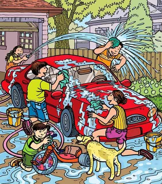 The image shared above depicts a car wash scene in which members of a family can be seen washing their car.