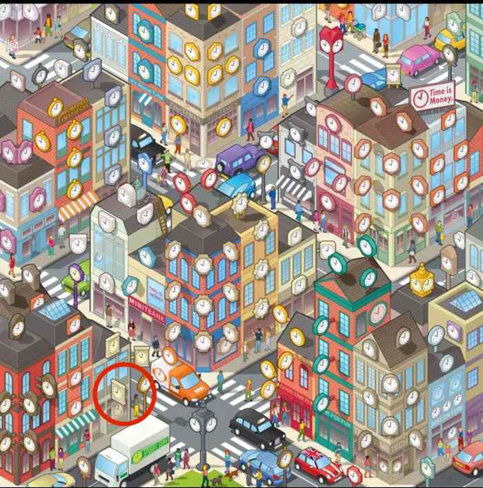 In this chaotic scene filled with clocks, there is a hidden clock which is not following the same time format and it is challenging to find it.