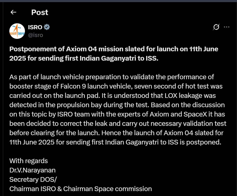 Apart from Gaganyaan, Shukla was chosen in 2024 to pilot Axiom Mission 4 (Ax-4) to the International Space Station (ISS). This will make him the first Indian astronaut to visit the ISS, marking a major milestone in India’s space journey. However, due to some technical issues with SpaceX's Falcon 9, the mission was postponed from June 10, 2025, to some other date.