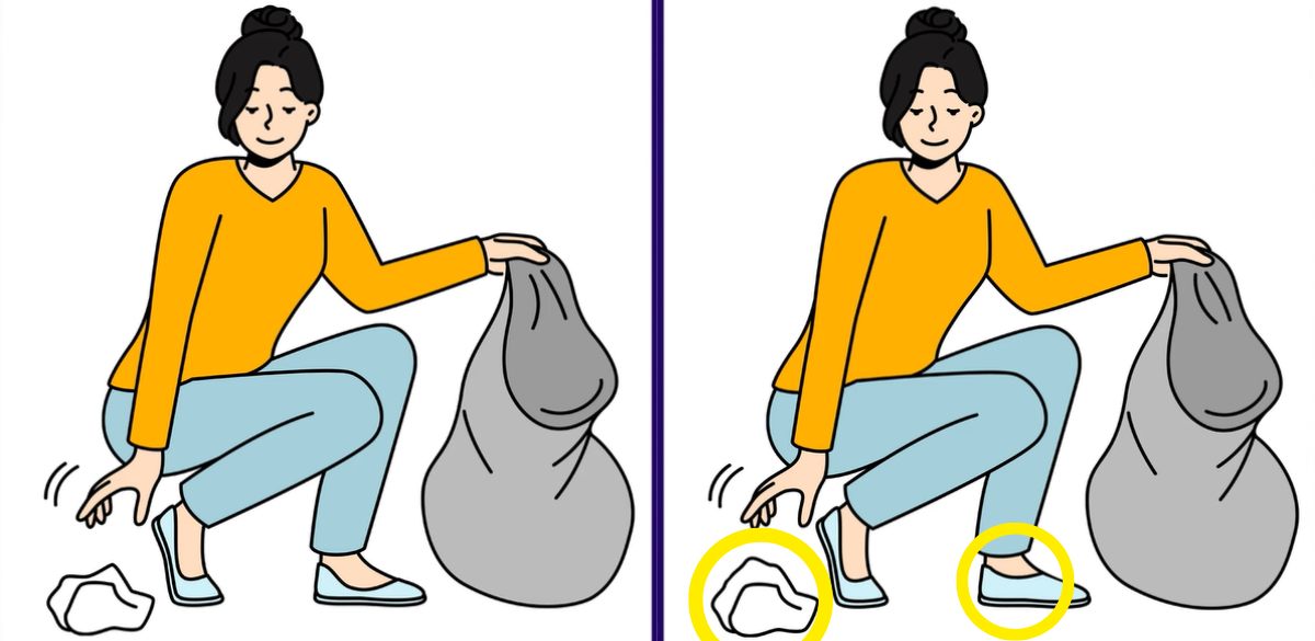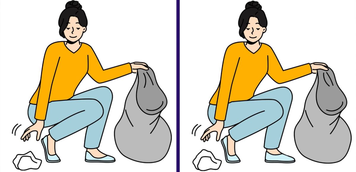 The image above depicts two identical pictures that are side-by-side, showcasing a girl cleaning her house. The girl is shown carrying a large trash bag and picking up a crumpled up piece of paper lying on the floor. The two images are almost identical, except for two differences between them.