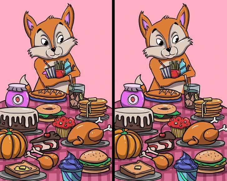 The image above depicts two identical pictures where you can see an adorable fox eating a table full of snacks. Although the images are nearly identical, there are exactly 12 differences between them. Can you find them all in 30 seconds?