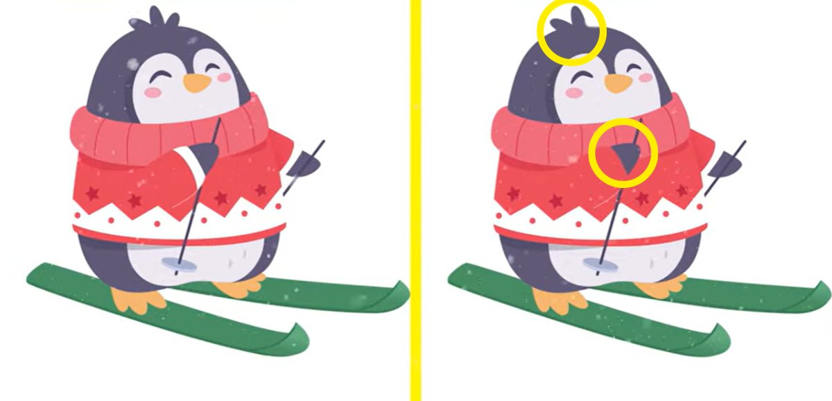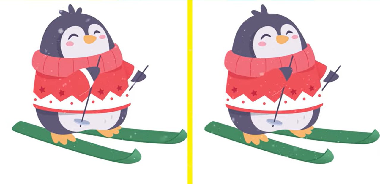 The image above depicts two identical side-by-side pictures where you can see an adorable penguin sledging in the snow. The penguin is wearing a cute sweater and is enjoying the sport. Although the images are nearly identical, there are 2 differences between them. Can you find them all in 5 seconds?
