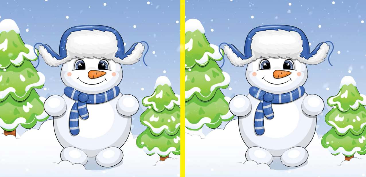The image above depicts two identical side-by-side pictures where you can see a cute snowman. The snowman is wearing a thick hat and can be seen smiling. Although the two images are nearly identical, there are 2 differences between them. Can you find them in 2 seconds?
