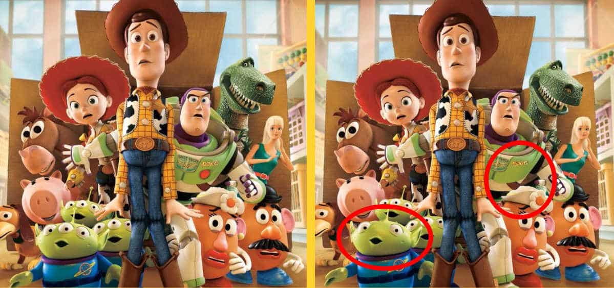 The differences between the two images can be anything from the position of an object to the colour of the object.