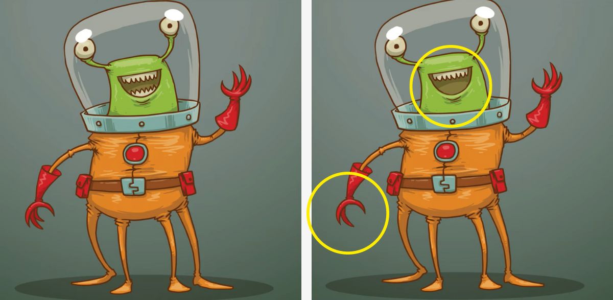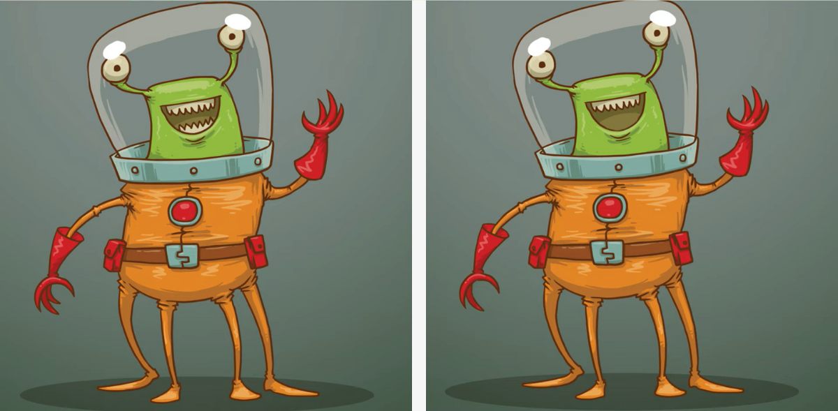 The image above depicts two identical pictures where you can see an alien waving its four-fingered hand at you. Although the images are nearly identical, there are 2 differences between them. Can you find them all in 7 seconds?