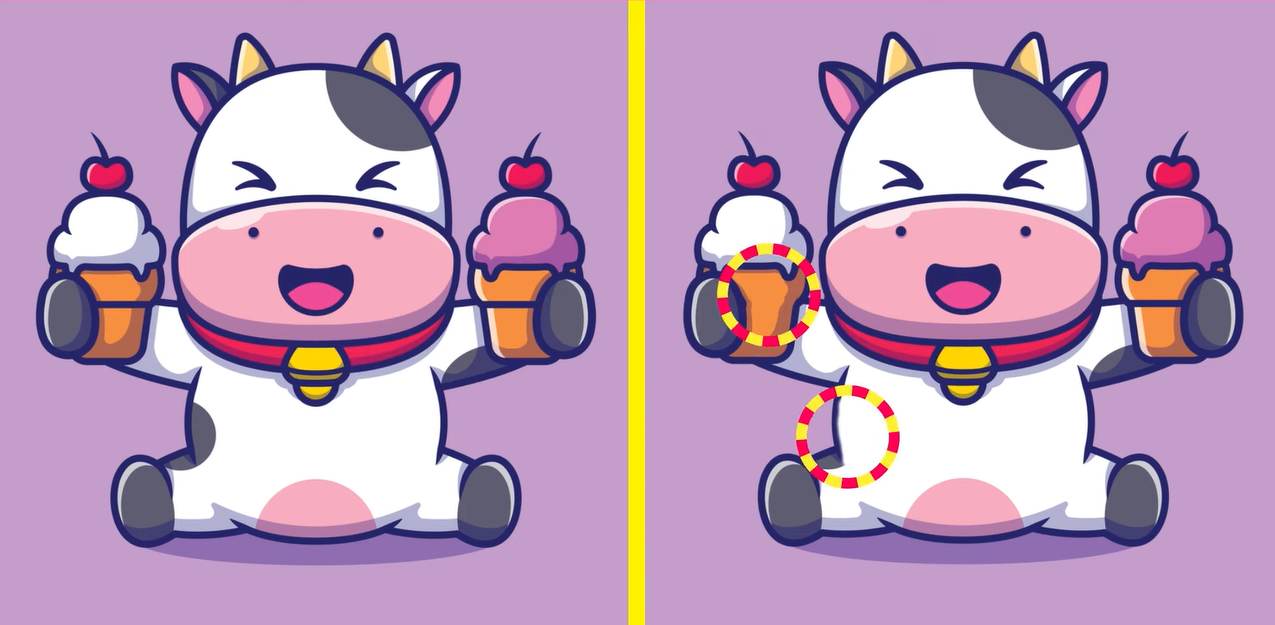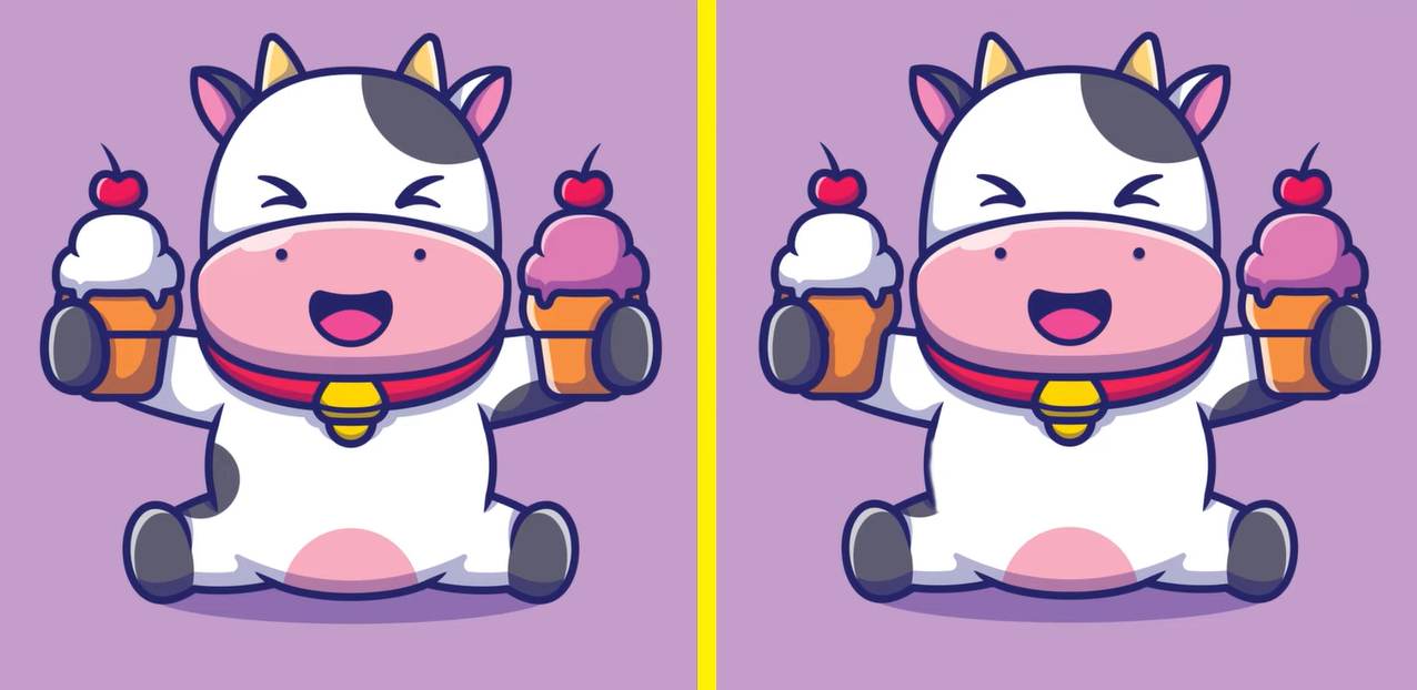 The image above depicts two identical pictures where you can see an adorable cow eating ice cream. Although the images are nearly identical, there are 2 differences between them. Can you find them all in 5 seconds?