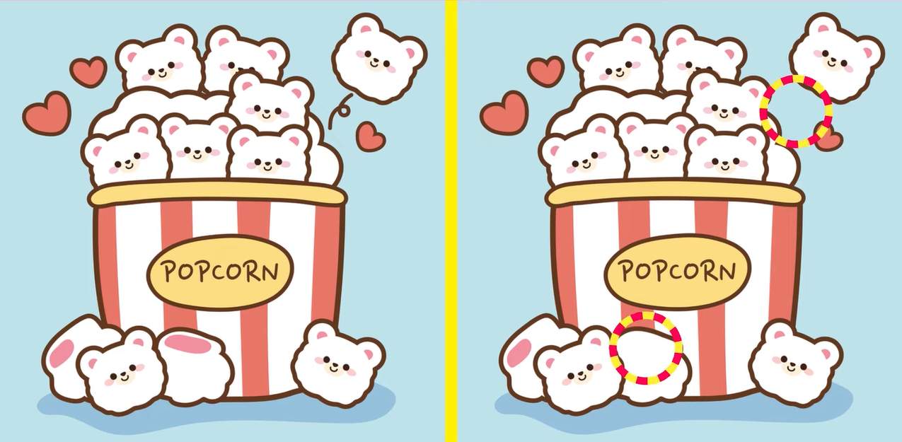 Here are the three differences between the two popcorn pictures. See them for yourself: