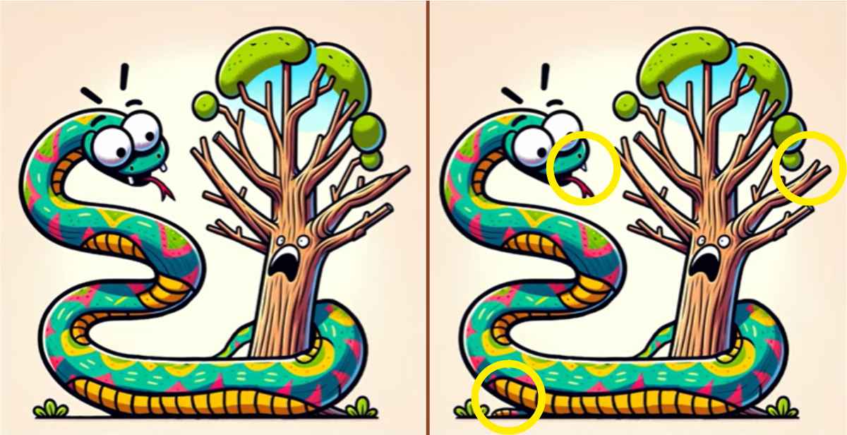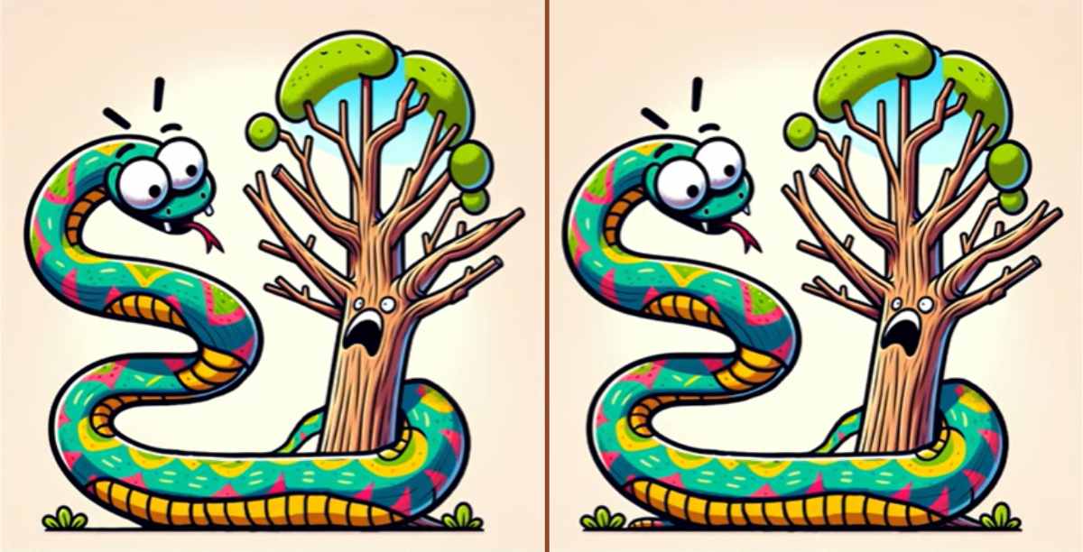 The image above depicts two identical pictures where you can see a giant snake, most likely an anaconda. The anaconda has wrapped its massive body around a tree that is screaming for help. Although the images are nearly identical, there are 3 differences between them. Can you find them all in 9 seconds?