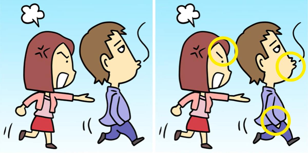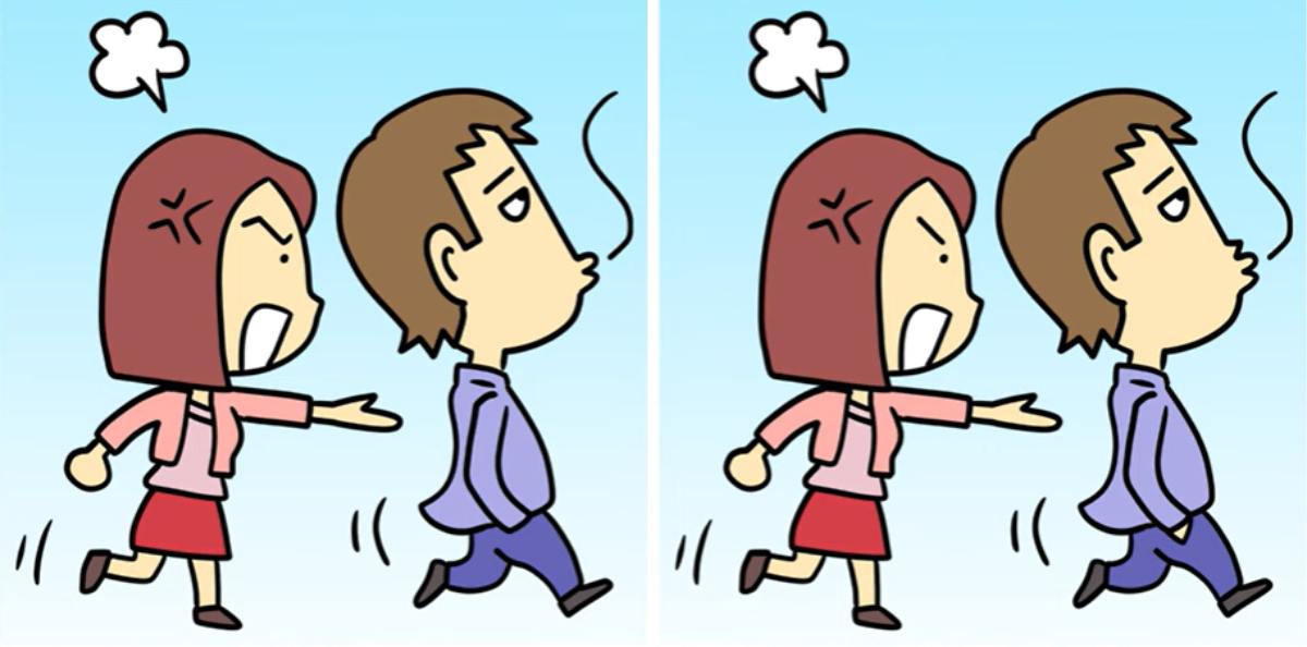 Challenge yourself with this fun and exciting spot-the-difference game! In the image above, you'll see two pictures of a couple, with the girlfriend looking angry at her boyfriend, who is whistling and walking ahead of her. Although the two images may seem identical at first glance, there are actually 3 differences between them. Can you find them all in just 9 seconds?