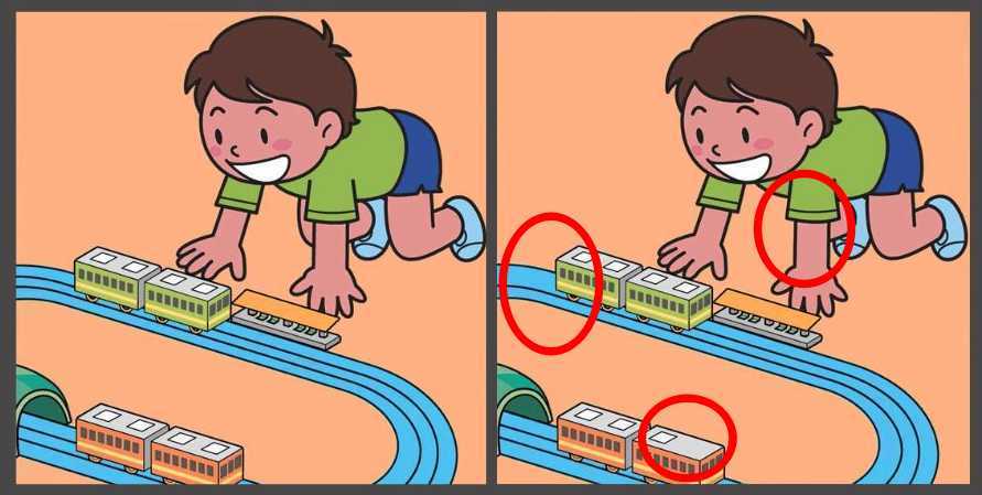This spot the difference challenge features two identical pictures of a boy playing with a toy train. Although the two images look identical at first glance, they are not. There are three differences between the two pictures.