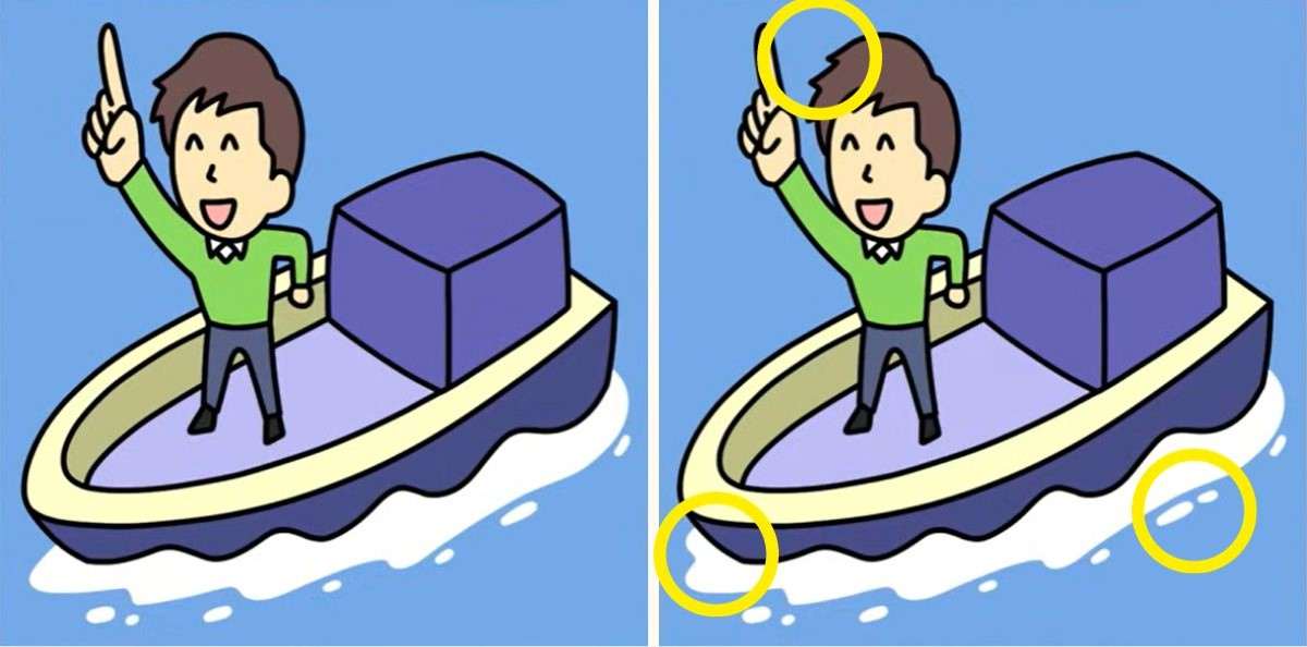 The image above depicts two identical side-by-side pictures where you can see a man on a boat. Although the images are nearly identical, there are 3 differences between them. Can you find them all in 9 seconds?
