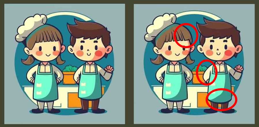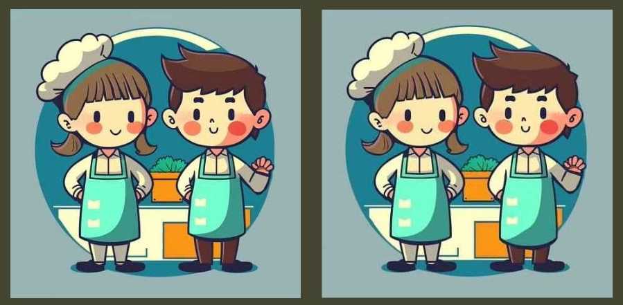 This spot the difference challenge features two identical pictures of a boy and girl chef. Although the two images look identical at first glance, they are not. There are three differences between the two pictures.