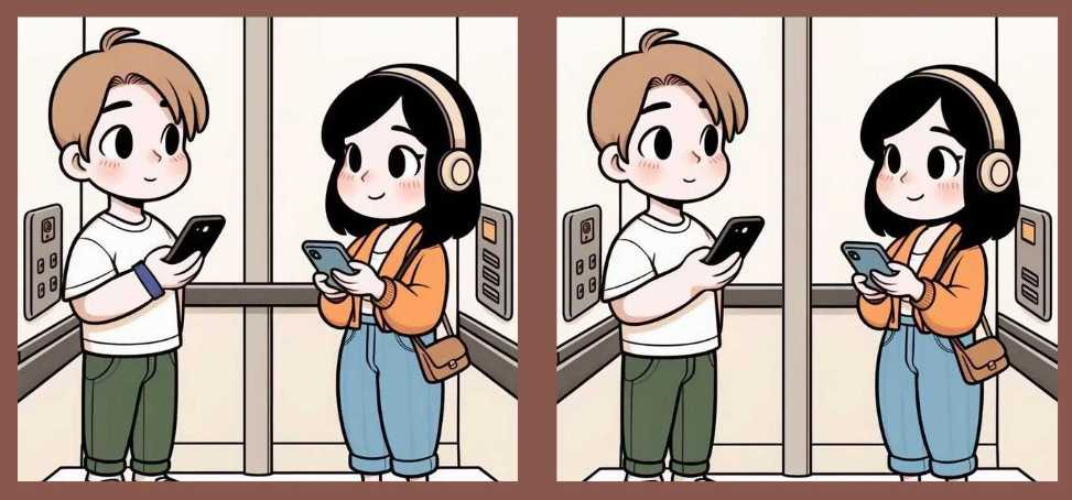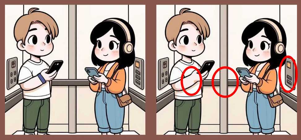 This spot the difference challenge features two identical pictures of a boy and girl in an elevator. Although the two images look identical at first glance, they are not. There are three differences between the two pictures.