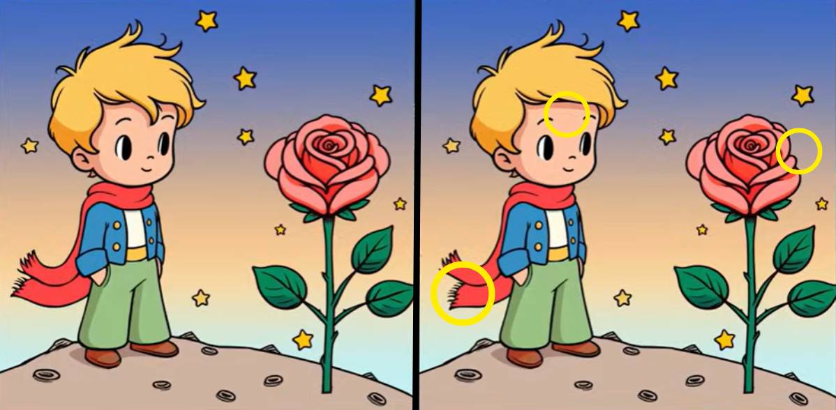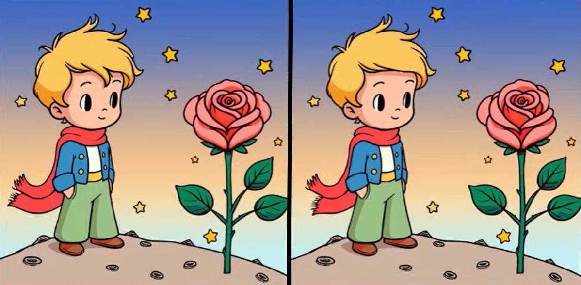 In the image displayed above, you can see two identical pictures, aligned side-by-side. The images show a little boy wearing a denim jacket and a red scarf, standing on the ground. He is fascinated by the red rose blooming in front of him. There are stars shining in the night sky and if you take a closer look at the two pictures, you will realise that the two pictures have 3 differences between them.