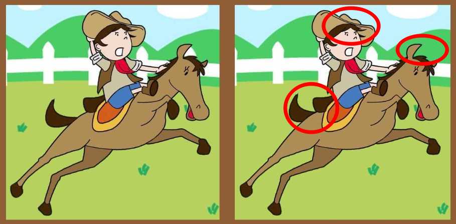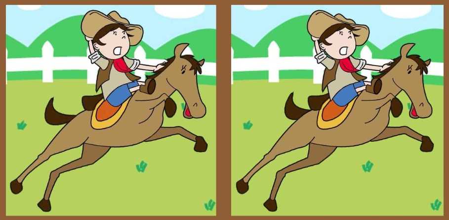 This spot the difference challenge features two identical pictures of a boy riding a horse. Although the two images look identical at first glance, they are not. There are three differences between the two pictures.