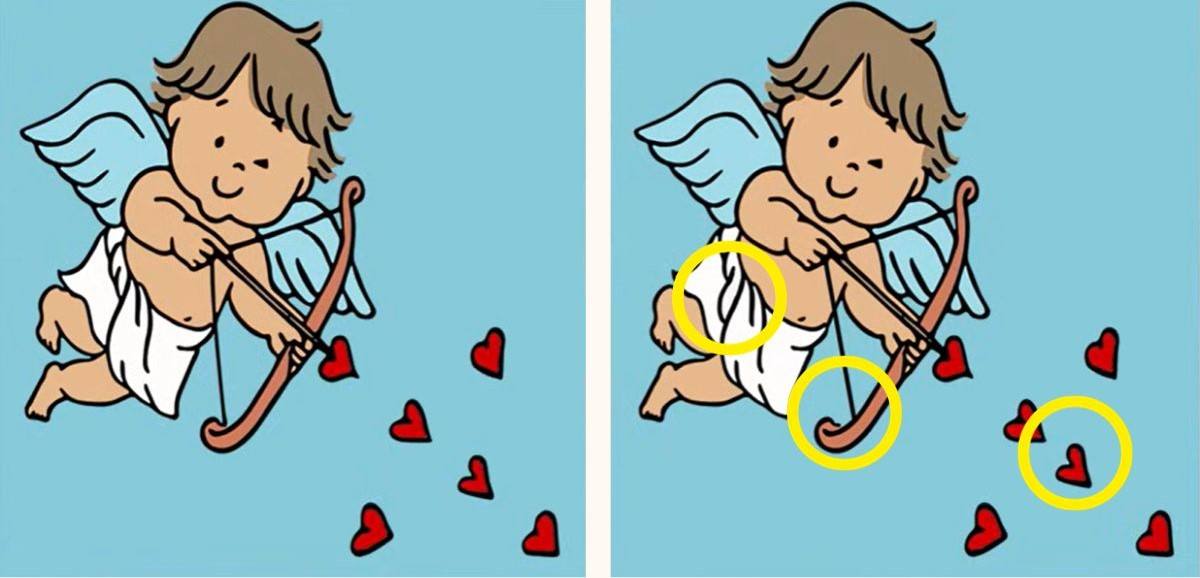 The image above depicts two identical side-by-side pictures where you can see the cupid shooting his arrow. Although the images are nearly identical, there are 3 differences between them. Can you find them all in 12 seconds?